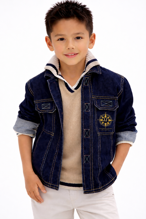 This boys premium denim jacket is our first signature outerwear piece from JJ Club “Adventure Awaits”, created by Jeune Julien for junior boys who love a polished look and a bold, active lifestyle. We designed this jacket for families who want something beyond basic kidswear—something that feels high-end, distinctive, and made to stand out.