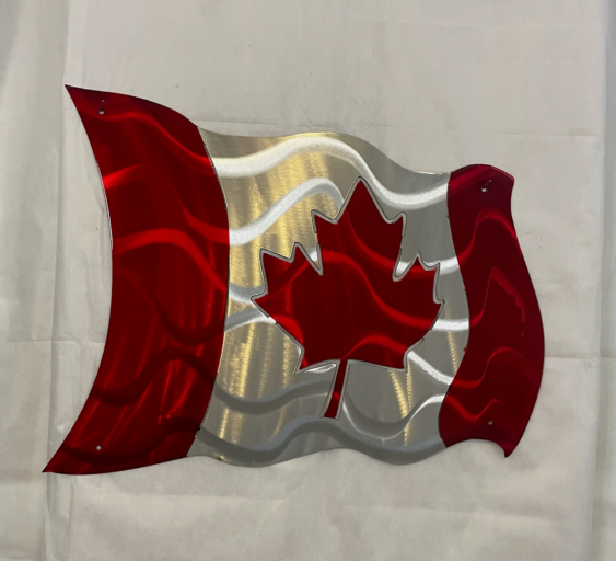 Bold and eye-catching, this Canadian flag metal art piece is crafted from 16 gauge aluminum and finished with a durable high gloss finish for a vibrant, reflective look. The layered design and flowing shape create movement and depth, making it a striking statement for indoor or outdoor display. Lightweight, weather-resistant, and built to stand out with true Canadian pride.