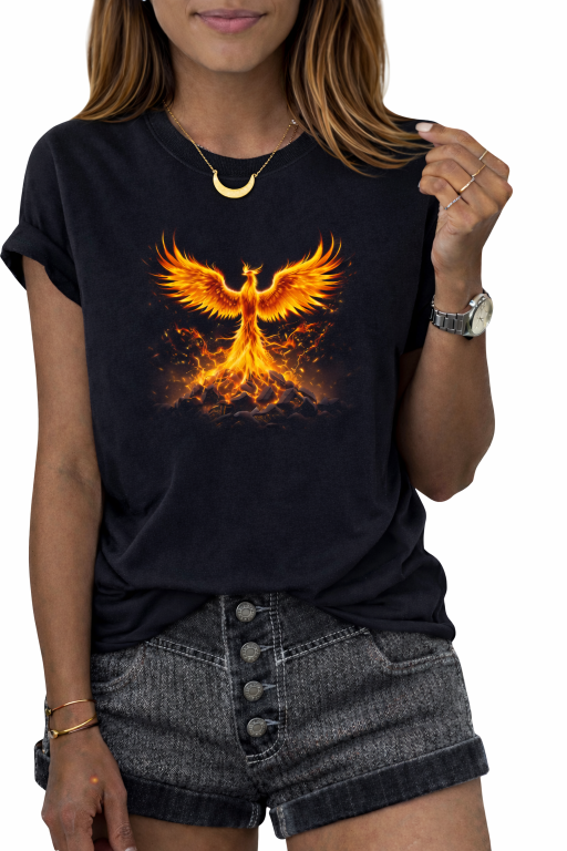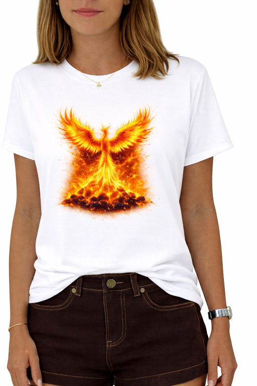 The Griffin Bird T-Shirt features a powerful, luminous design of a griffin rising from its ashes—an enduring symbol of strength, freedom, and rebirth. Surrounded by glowing flames and golden sparks, the artwork captures the moment of transformation, where resilience and inner power emerge renewed and unbreakable.