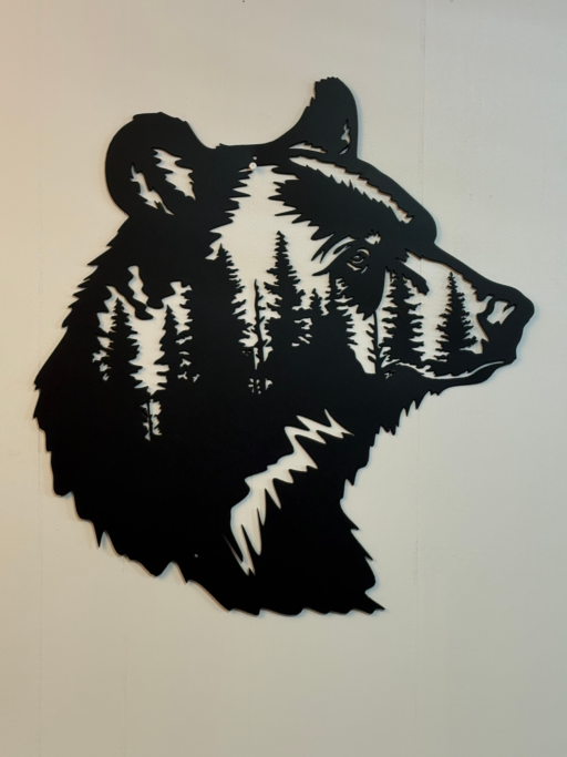 24” x 25”metal bear wall art curated from durable 16 gauge steel. Precision plasma cut with forest silhouette and matte black finish.