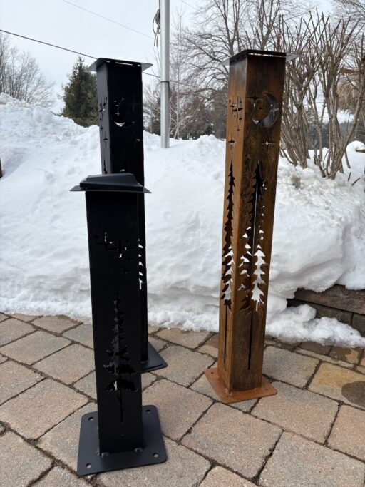 Handcrafted 4” x 4” solar steel garden light featuring precision-cut tree, moon, and star silhouettes. Designed for decks, walkways, gardens, and driveways, it casts a warm ambient glow at night while adding rustic or modern character by day. Durable, weather-resistant, and completely solar powered — functional outdoor art built for Canadian seasons.